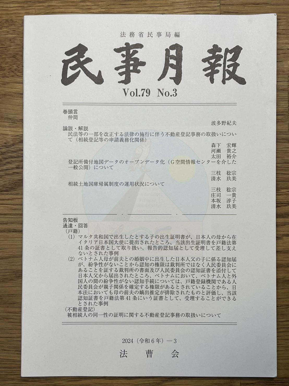 | 概要 | 巻頭言 仲間 論説・解説 民法等の一部を改正する法律の施行に伴う不動産登記事務の取扱いについて(相続登記等の申請義務化関係) 登記所備付地図データのオープンデータ化(G空間情報センターを介した一般公開)について 相続土地国庫帰属制度の運用状況について 法務図書WEB(https://homutosho.com/products/detail/746188)(参照2024年7月8日) |