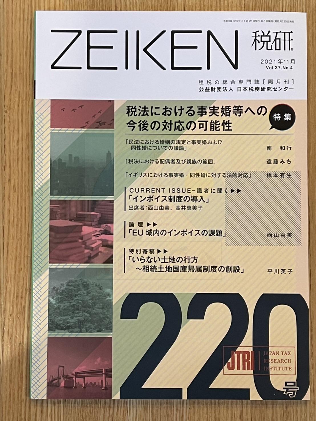 | 概要 | 特集:税法における事実婚等への今後の対応の可能性 民法における婚姻の規定と事実婚および同性婚についての議論 南 和行 税法における配偶者及び親族の範囲 遠藤みち イギリスにおける事実婚・同性婚に対する法的対応 橋本有生 CURRENT ISSUE―識者に聞く インボイス制度の導入 西山由美/金井恵美子 論壇 EU域内のインボイスの課題 西山由美 特別寄稿 いらない土地の行方~相続土地国庫帰属制度の創設 平川英子 公益財団法人日本税務研究センター(https://www.jtri.or.jp/books/detail.php?id=537)(参照2025年1月25日) |