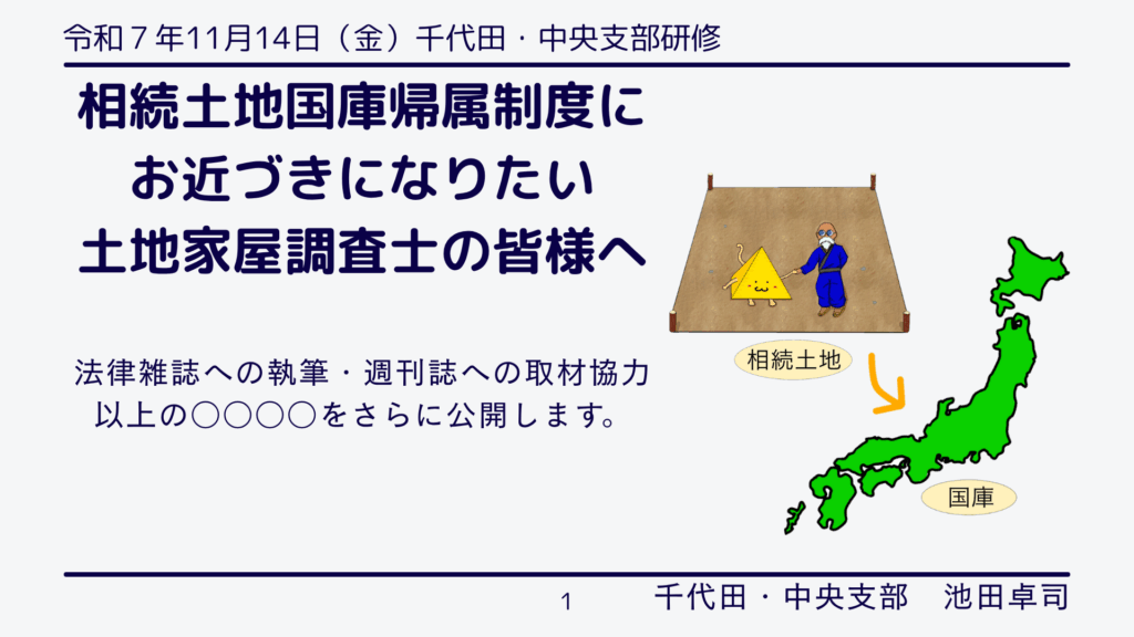 令和7年11月14日(金)に東京土地家屋調査士会の千代田・中央支部研修で相続土地国庫帰属制度の研修講師を担当しました。