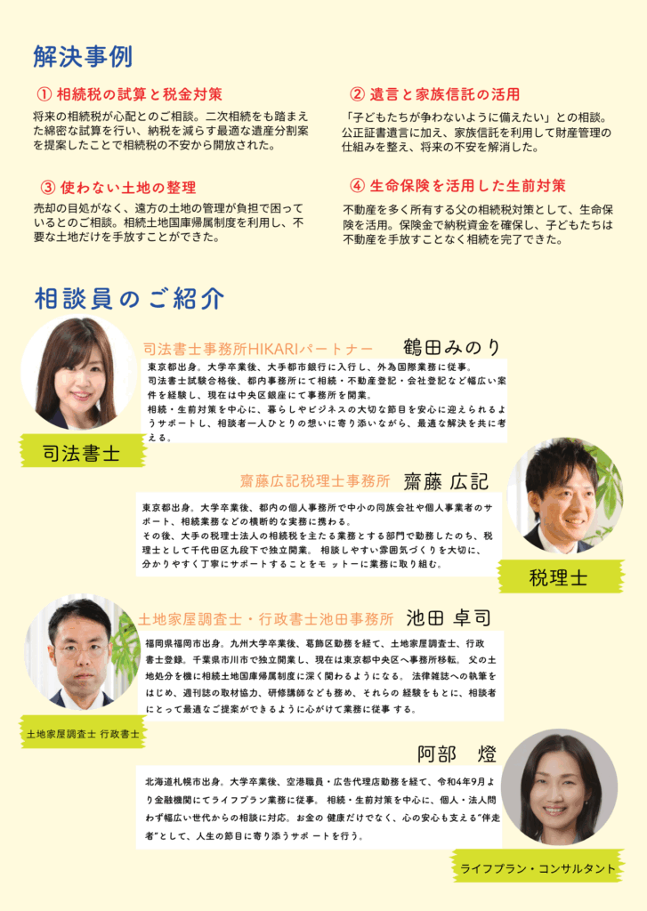 本相談会は、司法書士事務所HIKARIパートナー(東京都中央区銀座七丁目13番15号銀座菊地ビル5階)の司法書士鶴田みのり先生、齋藤広記税理士事務所(東京都千代田区九段北一丁目5番5号東建ニューハイツ九段806号室)の税理士齋藤広記先生、ライフプラン・コンサルタントの阿部燈さんとの共催です。