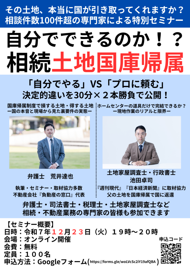この度、荒井法律事務所の荒井達也弁護士と相続土地国庫帰属制度の個人向けセミナーを開催することになりましたので、ご案内いたします。