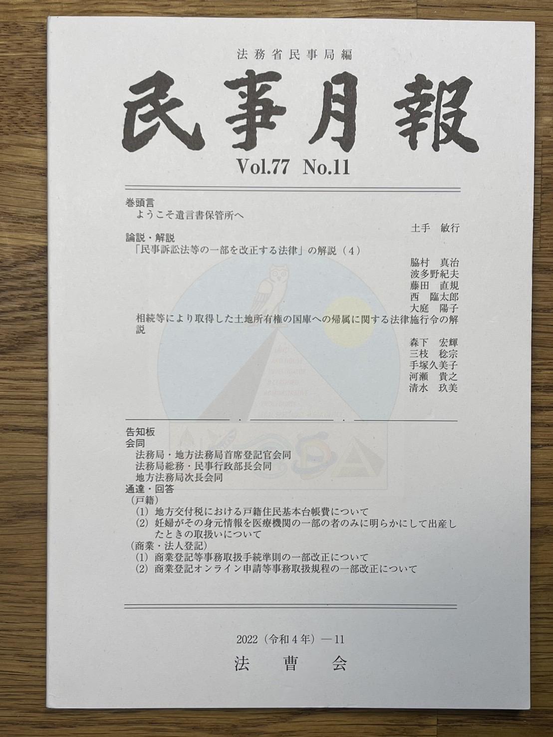 | 概要 | 巻頭言 ようこそ遺言書保管所へ 論説・解説 「民事訴訟法等の一部を改正する法律」の解説(4) 相続等により取得した土地所有権の国庫への帰属に関する法律施行令の解説 法務図書WEB(https://homutosho.com/products/detail/636866)(参照2024年7月8日) |