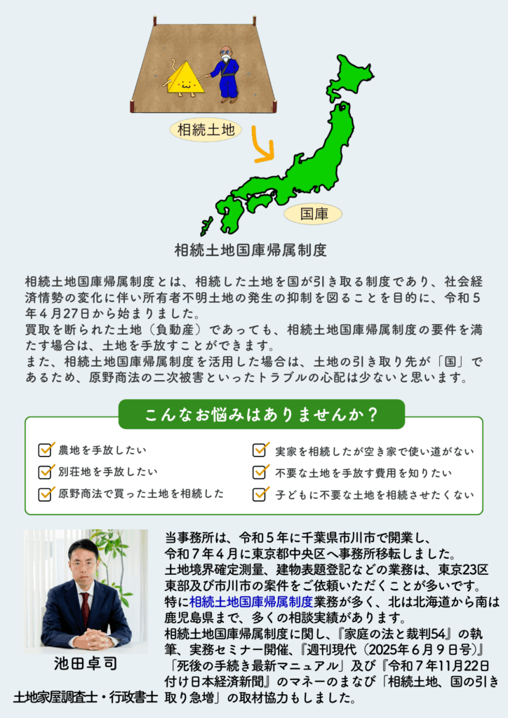 代表の池田卓司(土地家屋調査士・行政書士)は、相続土地国庫帰属制度に関し、法律雑誌への執筆、週刊誌・新聞社への取材協力、研修講師なども務めました。